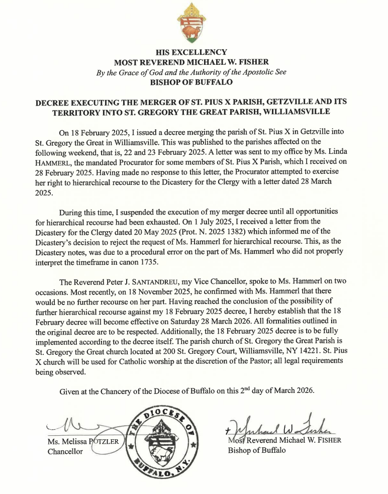 St. Gregory the Great Parish in Williamsville. As of March 27, 2026, St. Pius X has merged into St. Gregory the Great Parish, and will serve as a secondary worship site.